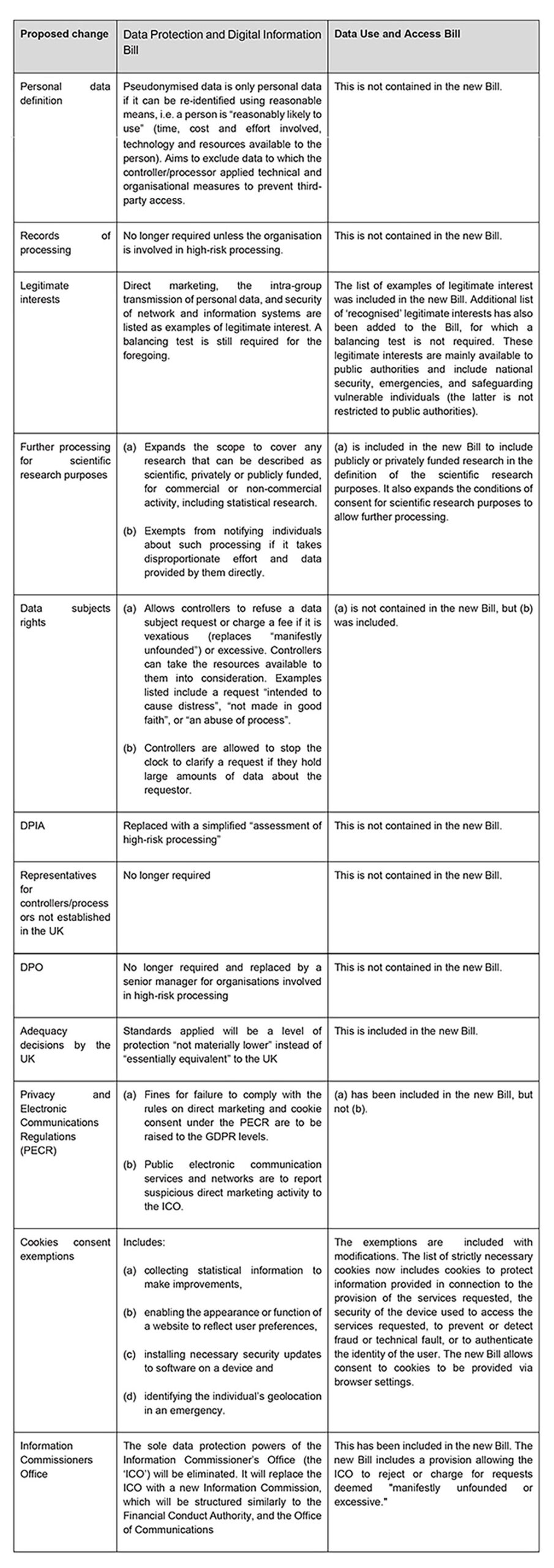 The data protection section is covered in part 5 and it contains some of the changes to the data protection requirements proposed by the previous government in the Data Protection and Digital Information Bill (the “previous Bill”), which failed to pass before the general election. Please see a table showing what changes were kept from the previous Bill below. The new Bill also introduced new additions, such as the following: